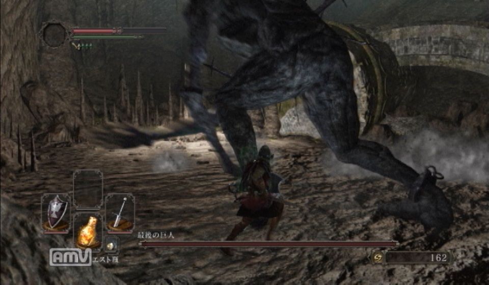 巨人のお尻の下で、やや巨人の左足側に陣取って攻撃を入れます。左足が上がったら、少し下がって距離をとる。時計反対周りの容量で巨人を少しずつ回転させながら左足攻撃を誘発していくと倒しやすいと思います。